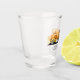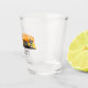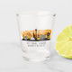 Le verre de tir présente la silhouette de la ligne d'horizon de la ville de Las Vegas Nevada avec éclaboussure d'aquarelle au coucher du soleil et coordonnées de latitude et longitude sur l'arrière - plan jaune pâle. Grande faveur ou cadeau pour la fête de mariage et les invités.