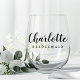 Lunettes de vin sans cachet avec votre nom personnalisé dans une police de script mignonne avec le texte personnalisable "bridesmaid" ci-dessous.