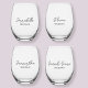 Verre à vin moderne sans tige avec texte personnalisé pour femme de ménage, mariée, femme d'honneur ou mère de la mariée et du marié. Ajoutez votre propre nom et le titre de la fête de mariage à chaque verre. Veuillez utiliser le bouton Message me ci-dessous pour obtenir de l'aide sur la personnalisation et les demandes spéciales.