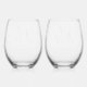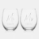 Ensemble chic de verres à vin sans tige pour la mariée et le marié avec "M." et "Mme" dans un mince script moderne et leur nom marié dans une typographie élégante.