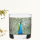 Verre à Whiskey qui présente l'image photo d'un beau paon bleu avec un plumage de queue coloré. Image imprimée sur un côté du verre.