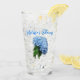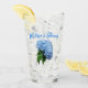 Bleu hydrangée, image de fleur coupée sur verrerie claire. Le grand verre à boire a l'image fleurie des deux côtés. Pétales bleu clair et feuilles verts au sommet d'une tige courte.