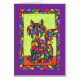 Cette chatte unique et colorée est assise contre un arrière - plan vert printanier et regarde la spectatrice, montrant ses marques multicolores ressemblant à des mosaïques qui ressemblent à des vitraux. Toute la scène est entourée d'une bordure multicolore détaillée qui correspond à ses marques.