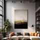 Eine ätherische urbane Landschaft, umgeben von Nebel und goldenem Licht. Große Gebäude lösen sich in der Ferne auf und schaffen ein Gefühl von Geheimnis und Nostalgie. Ein Werk, das die Schönheit der Unbeständigkeit und den Power der Zeit hervorruft.