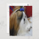 Weiß und braun shih-tzu Hund mit einem Bogen im Fell.