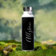 Vertikaler Name, weißes Skript, schwarz Trinkflasche