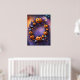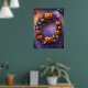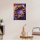Fügen Sie Ihrem Halloween-Dekor eine Touch Zauber hinzu mit diesem bezaubernden Poster. Dieses Kunstwerk mit einem wunderschön gearbeiteten Kranz aus lila und blauen Ästen, mit leuchtenden orangen und blauen Kürbissen geschmückt, fasziniert den spukhaften und festlichen Charakter Halloween. Vollmond, fliegende Fledermäuse und verstreute Herbstblätter im Hintergrund verstärken die unheimliche Atmosphäre und machen sie zu einer perfekten Ergänzung Ihrer saisonalen Dekoration.