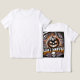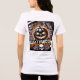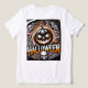 Der T - Shirt im Bild hat ein Halloween-Design mit einem Zentralbild eines Orangenkürbchens mit bedrohlichem Gesicht, umgeben von zwei Schädeln, Spinnennetzen, Fledermäusen und Vollmond mit einer zusätzlichen Fledermaus-Silhouette. Das Wort "HALLOWEEN" wird am unteren Rand in fett formatierten Schriften hervorgehoben dargestellt.