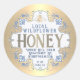 Ein extravagantes Vintages, kreisförmiges Blumendesign mit Honigbiene und gepunktetem Rahmen mit "HONEY", in einem Schriftart mit Schlagzeilen in einem metallischen Goldgradienten geschrieben. Weißer und goldener Hintergrund.