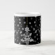 Trinken Sie Ihren Kaffee, Tee oder heiße Schokolade im festlichen Stil aus dieser Jumbo-Tasse (20 oz) mit meinem Foto eines weißen Weihnachtsbaumschmucks und dem Hintergrund mit digitalen Kunstschneeflocken. Das Design befindet sich auf einem transparenten Hintergrund, sodass Sie auf eine andere Hintergrundfarbe als schwarz klicken können.