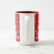 Trinken Sie Ihren Kaffee, Tee oder heiße Schokolade im festlichen Stil aus dieser Tasse mit meinem Foto eines weißen Weihnachtsbaumschmucks und dem Hintergrund mit digitalen Kunstschneeflocken. Das Design befindet sich auf einem transparenten Hintergrund, sodass Sie auf eine andere Hintergrundfarbe als Rot klicken können.