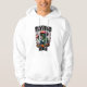 Short description: A white hoodie with a bold and distinctive design featuring a skeleton wearing a mushroom hat and smoking, sitting on a skateboard with the "FLYING HIGH" logo surrounding it. Perfect for streetwear enthusiasts and those who appreciate unique designs.