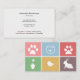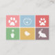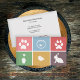 Eine Visitenkarte für alle Haustierdienste wie Tierarzt, Hundewanderer, Katzensitzer, fütternd Kaninchen, Fischpflege, Vogelpflege, Pflanze, Boarding von Haustieren, usw. Die Rückseite ist mit farbigen Quadraten und Bildern von Katzenpfoten, Hundepfoten, Fischschüssel, Topfbällchen, Pflanze, Vögel und Kaninchen versehen - man kann sie mit eigenen Fotos, Logos oder Bildern ändern