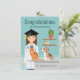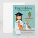 Herzlichen Glückwunsch an einen Tierarzt zu seinem Abschluss mit diesem personalisierbaren Design, in dem Desteis originelle niedliche Cartoon-Illustration einer Tierärztin in einem Untersuchungsraum einer Tierklinik gezeigt wird. Der Tierarzt trägt eine schwarze Graduationskappe mit einer gelben Tassel, einem weißen Labormantel, blauen Peelings, und sie hat ein Stethoskop um ihren Hals. Der Tierarzt hat braunes Haar und einen lächelnden Gesichtsausdruck. An der Wand befinden sich zwei braune, schwimmende Regale mit einer grünen Pflanze und zwei kleinen, auf sie platzierten Medizingläsern. Vor dem Tierarzt sitzen eine orangefarbene Katze und ein brauner und weißer Welpe auf einem grauen Untersuchungstisch. Es gibt auch personalisierbare Textbereiche, die ideal sind, um eine benutzerdefinierte Nachricht zusammen mit dem eigenen Namen des Absolventen zu schreiben.