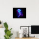 Large, blue, artistically drawn, glowing, bright jellyfish, with long tentacles on black background with purple bioluminescence. Luminous jellyfish.