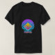 A vibrant, stylized logo featuring a yellow diamond shape with a white outline, set against a circular gradient background transitioning from purple to pink. Inside the diamond, a multicolored flame design incorporates shades of purple, blue, and pink, with intricate patterns and dynamic lines adding energy and movement. The white background highlights the bold and lively colors, making this logo design perfect for modern, creative, and energetic fashion projects or graphic tees.