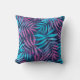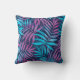 Front and back views of a pillow with a vibrant leaf pattern. Leaves in pink and blue shades cover a dark background, creating a tropical feel."