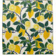 Das Muster zeichnet sich durch ein lebendiges und lebendiges Design mit üppigen Zitronenbäumen aus. Die Äste sind mit reifen, hellgelben Zitronen geschmückt, von denen einige aufgeschnitten sind, um ihre saftige Inneneinrichtung zu zeigen. Die Zitronen sind von tiefgrünen Blätter umgeben, die sich wunderbar mit dem warmen, cremefarbenen Hintergrund abwechseln. Der Gesamtstil ist gewagt und stilvoll, mit klaren Linien und einem Gefühl der Symmetrie, und schafft eine frische und fröhliche Ästhetik, die an eine mediterrane Atmosphäre erinnert.