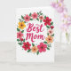 Designed with a bright digital illustration, this Mother’s Day card centers a loving message inside a ring of flowers that feels like a gentle hug ❤️. In the middle, the words “Best Mom” sit prominently in flowing fuchsia lettering, with rounded strokes that look soft and affectionate. The text is placed dead center, leaving airy space around it so the message stands out clearly against the white background. Surrounding it is a circular wreath of stylized blooms and leafy greens, arranged evenly to suggest care and closeness. The flowers mix scarlet red, rosy pink, golden yellow, and apricot orange petals, each with a darker, textured center that adds depth without looking busy. Green leaves in slightly different shades weave between the blossoms, and small muted grey‑green dots appear here and there like tiny connectors 🌼. The background stays plain white while the wreath forms a neat circle around the fuchsia words.