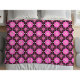 Towel set featuring a vibrant pink and purple pattern with circular designs on a dark background. The set includes a hand towel and washcloth displayed against a light wall, conveying a modern and stylish look."