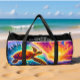 This colorful design duffel bag showcases a vibrant and artistic colorful pattern of a swimming sea turtle amidst a breathtaking sunset and ocean waves. It's a stylish and functional travel accessory, perfect for anyone seeking an expressive and unique design in their carrying bag.