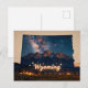 This mesmerizing, conceptual painting of the Wyoming state map captures a stunning nighttime scene, showcasing majestic mountains and small town lights beneath the brilliance of the visible Milky Way.