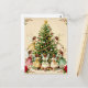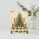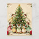 A group of delicate fairies with gossamer wings gathers around a grand vintage Christmas tree adorned with old-fashioned ornaments — glass baubles, tinsel, candles, and lace ribbons. The fairies wear Edwardian-style dresses in soft creams, golds, and faded greens. The scene is painted in a warm, nostalgic palette with a textured, aged paper background reminiscent of vintage decoupage. Include botanical details like holly, pine cones, and poinsettia flowers framing the composition.