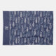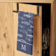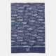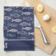 Ein Muster aus weißen und hellblauen Fischzeichnungen auf marineblau Untergrund macht dieses Küchentuch einzigartig! Die Bilder werden auf einem dunkelblauen Hintergrund platziert, und ein passender Rand am unteren Rand enthält Ihr Monogramm oder einen anderen Text.