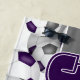 Dieses sportbezogene Strandtuch für Fußball-Spieler verfügt über eine Reihe lila, grauer und weißer Fußballbälle, die auf einem individuell anpassbaren, weißen Hintergrund gedreht werden - personalisieren Sie den Namen und die Trikot-Nummer des Athleten sowie den Namen des Teams und des Maskottchens - von katz_d_zynes