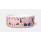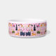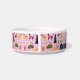 Viele Hunde verschiedener Rassen tragen Kleidung und Halsbänder, Hundepfoten und Hundeknochen auf rosa Untergrund.