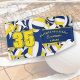 Dieses coole Handtuch für Volleyballspieler ist mit blau, goldfarbenen und weißen Volleyballbällen, die auf weißem Hintergrund gedreht werden, und einer prominenten Jerseynummer in Gold, die sich über einen katz- und blau-farbigen Streifen erstreckt, auf dem Sie auch den Namen, den Teamnamen und den Maskottnamen des Athleten personalisieren können - von katz_d_zynes