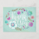 Diese elegante Dankeschön-Karte ist mit aquamarinen und lila Blumen und die Worte danken Ihnen in einem schönen weißen Drehbuch entworfen. Schreiben Sie Ihre eigene Nachricht auf der Rückseite der Karte. Entworfen für Sie von BlackBerry Boulevard.