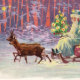Frohe Weihnachten aus Wien Woods! Der kleine Schlitten des Weihnachtsmanns wird von zwei empfindlichen Rentieren durch einen schneebedeckten Wald gezogen. Die Szene ist zitternd mit Lichtern aus dem kleinen reisenden Weihnachtsbaum. Korallen-, Lavendel- und Aquarelle in abstrakten Mustern schaffen einen wunderschönen theatralischen Hintergrund. Diese antike europäische Illustration ist durch die Zeit anmutig gereist, um unsere Weihnachtskorrespondenz und Geschenke des 21. Jahrhunderts zu schmücken. Die trendigen Farben und das einzigartige Bild sind perfekt für Ihre Feierlichkeiten.