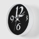 Eine große, runde Uhr mit nur vier sehr großen funky Zahlen, 3, 6, 9 und 12, in Weiß auf schwarzem Hintergrund.