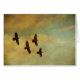 Foto von vier Raben, die in Bildung hinter den Wolken in einem blauen Himmel fliegen. Eine Beschaffenheit wurde diesem Bild hinzugefügt, um ihm einen antiken Blick zu geben.