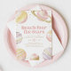 Feiern Sie die Ankunft eines Kleinen mit dieser eleganten, rosa, lila und goldenen Geburtstagseinladung im Weltraum.