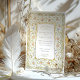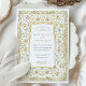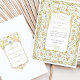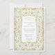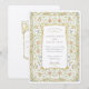 Diese romantische Hochzeitseinladung vereint den Charme eines englischen Gartens mit seiner Viktorianisch inspirierten Blumengrenze und eleganten, handgezeichnet Details. Das Design besticht durch einen Rahmen aus weichen pastellfarbenen Blüten in Rosa, Buttercreme, Blau und Pfirsich, die alle mit grünen Weinreben und antiken Goldakzenten verwoben sind. Das zentrale Panel zeigt klassische Typografie, die Formalität mit Wärme in Einklang bringt und so ein anmutiges Einladungs-Layout schafft. Auf der Rückseite des Hotels befindet sich ein zartes, blumengeschmücktes Wappen, umgeben von verzierten goldenen Schnörkeln und symmetrischen Rollen. Ideal für Paare, die eine romantische Gartenzeremonie oder eine Feier mit Vintagem Flair und botanischer Eleganz planen.