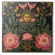 Vintage Keramik Kachel mit der Sonnenuntergang mit einem weiblichen Gesicht, umgeben von Schmetterlingen, Motten, rosa Blume und grünen Blätter auf dunklem Hintergrund.