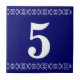 Viktorianische Hausnummer-Fliese - Weiß auf Blau mit einer gelockten Stichwortgrenze.