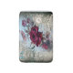 Schöne, Vintage rote Rose-Florale im Zeitungsdruck, mit Perlenfibel und Halskette aus Imitaten, Vogelkäfig mit aquamarinem Bogen, um einen luxuriösen, extravaganten, viktorianisch schicken Stil für eine schöne Badedekoration zu schaffen.