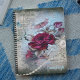 Liebliche, Vintage rote Rose-Florale im Zeitungsdruck, mit Perlenfibel und Halskette aus Imitaten, Vogelkäfig mit aquamarinem Bogen, um einen luxuriösen, extravaganten Shabby Chic-Stil für die Planung zu schaffen.