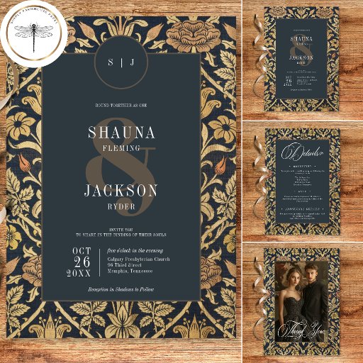 Lassen Sie sich von der Verzauberung der Vergangenheit verzaubern, indem Sie mit unserer Vintagen Blumenhochzeit die Dattelkarte speichern. Inspiriert durch die ikonischen Entwürfe von William Morris, bieten diese Einladungen eine faszinierende Mischung aus Vintagen Tönen - launische Schwarze, gedämpfte Rot, sanfte Tans, Golden und Cremes. Die aufwändigen Blumenmuster, die an die Jugendstil-Ära erinnern, strahlen eine Touch der Dunkelheit aus und verleihen Ihrem besonderen Tag einen geheimnisvollen Reiz. Der mit Vintagen Schriftart geschmückte Textbereich aus Holzkohle bietet einen beeindruckenden Kontrast zu den zahlreichen Tapisserien. Dieses zeitlose Design vereint klassische Romantik und ist somit die perfekte Wahl für Paare, die eine wirklich einzigartige und unvergessliche Einladung suchen. Erstellt von der einfachen Farmhouse Press.