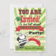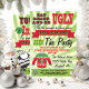 Soirée de Noël super amusante et moche avec une sensation rétro. Lettres modernes, bannières et un pull moche contre un arrière - plan qui éclate de soleil. Le dos est un grand comme le devant avec l'ancienne image clipart du Père Noël rétro et des informations de fête. Illustration tirée à la main par McBooboo. com