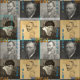 Vincent van Gogh Gewebe, Remake mit vier berühmtes Selbstporträtzeichnungen in der warmen einfarbigen Palette und stilvoller Schriftarttext mit berühmten "Starry Nacht-" und "Sonnenblume" Malereien in den blauen gelben Hintergrundfarben