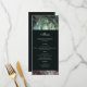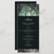 Une aquarelle fantaisie illustrant le feuillage luxuriant vert émeraude et mauve et violet, brillant de lumières féeriques et de poussière magique, orne cette carte de menu d'automne du printemps avec un thème de forêt enchanté. Idéal pour les amateurs de forêts de contes de fées, de forêt de fées ou de jardin de fées et de vert émeraude, de mauve et d'or.