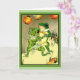 Eine Vintage Abbildung eines Froschpaares, das auf Hinterbeinen unter dem Licht japanischer Papierlaternen tanzt, während ein Duo aus geflügelten Insekten die Musik spielt. Mr. Frog trägt einen steifen weißen Kragen und eine gelbe Krawatte. Frau Frog trägt einen schieren weißen Schal, der mit Spinnennetzen verziert ist. Tanzen im Mondschein! Die Innenseite der Karte ist leer für Ihre eigene Nachricht.