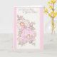 Ein Vintages Grußkartenbild zeigt ein süßes Mädchen in einem rosafarbenen Kleid, das an einem Kissen mit Rüstung liegt. Blume umgeben sie und Spielzeug sind zu ihren Füßen. Auf der Vorderseite der Karte steht: "Ein kleines Mädchen zu Hause?" Die Botschaft in der Karte lautet: "Ein süßer kleiner Schatz, der von oben geschickt wird, ein Coo und ein Lächeln, verpackt in Liebe. Herzlichen Glückwunsch zu Ihrem neuen Mädchen!"