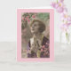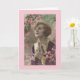Ein Vintages, getöntes Foto einer jungen Frau, die im Garten sitzt, während sie ein Buch liest. Aus dem Buchcover scheint es ein Romanzroman zu sein. Sie klopft es über ihr Herz und secht, während sie davon träumt, eine Romanze wie die Liebenden im Buch zu haben. Die Meldung innerhalb der Karte lautet: "Ich wollte ein Märchenende."