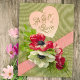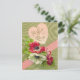Sehr hübsches antikes Bild mit weißer und rosa Blume, rosa Band und Herz auf grünem Moiruntergrund.