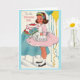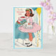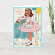 Ein Vintages Geburtstagskartenbild für eine junge Dame mit den Begriffen "Für das Geburtstagskarte" und einem hübschen jungen Verpassen in einem rosa Kleid, weißer Schürze, weißen Handschuhen und Socken sowie schwarzen Lacklederschuhen. Sie trägt ein blühendes Bündchen und hält blaue Blumen in der Hand. Hinter ihr stehen die Geburtstagsballons und ein Tisch, auf dem ein Geburtstagskuchen gewartet wird. Die Botschaft in der Karte lautet: "Es ist immer eine Leckerei, jemandem so süß einen guten Geburtstag zu wünschen."